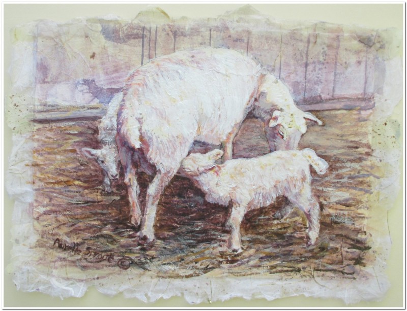 Aurelle Sprout, Milk Break. Mixed media, 12 inches x 16 inches. Thank you, Beechtree (Organic) Farm owners, for permitting me to photograph this beautiful ewe with lambs in preparation for my painting. sold