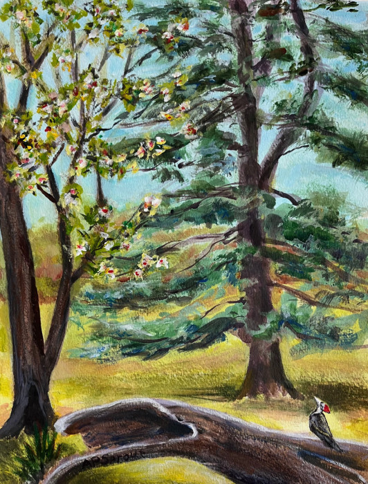 Acrylic on archival watercolor paper. 14 x 18 x 1.5 inches framed. Living surrounded by woods, wildlife has a chance to live freely. Apparently Pileated Woodpeckers aren't bashful. However, only after I painted this view from our front yard that I painted her/him in. That log beckoned for something to be placed on it, and I remembered a previous occasion where I saw the Pileated fairly close by!