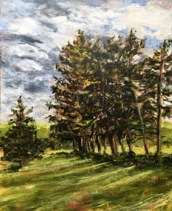 Acrylic on canvas panel, 16 x 20 inches. This was one of my first en plein air paintings I did after COVID's lockdown. I was moved by the beauty and excitement of the view as I sheltered behind the barn and secured my work and supplies due to the strong wind.