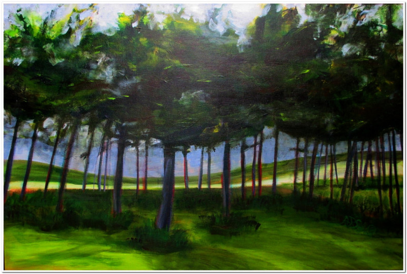 Before the Storm, Acrylic on canvas. 24" x 36." Marveling at this hedgerow of trees literally before a storm was about to descend, I began the painting in plein air. However, the wind became too great for this rather large canvas and knocked it down several times before I continued the painting under a dry studio’s roof.