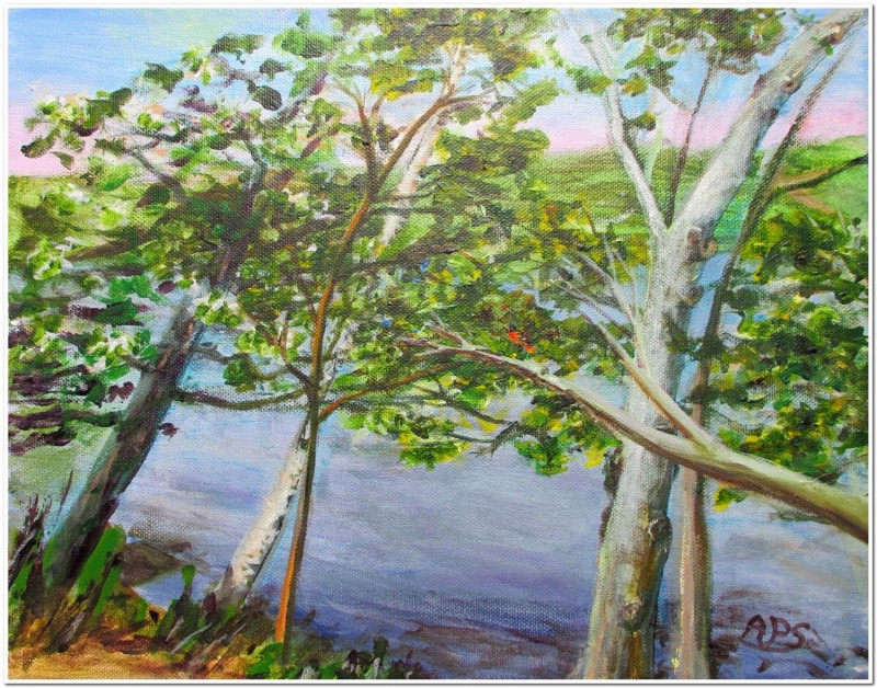 It Sang to Me. Acrylic on canvas, 11" x 14." Searching for a view while plein air painting at the Plainsboro Preserve where New Jersey Audubon Society is located--a beautiful Baltimore Oriole was perched in one of the tree's branches. This beautiful bird not only surprised me with the honor of its presence, it also SANG its melodious tune to me. I was hooked upon painting this spot. However, since the oriole flew away within seconds, I was left to paint with only the magic of its presence there.